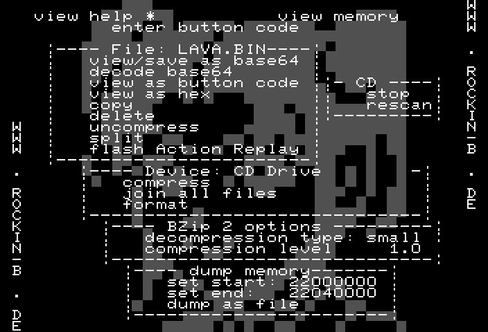 Then the arflash program from ExCyber is started where you can initiate the flash by pressing START+A+B+C together. Note that it'll take a while until it starts flashing. Memory ViewerYou can view anything in combined hex+text view: files memory regions of the SEGA Saturn Action Replay firmwares on cart And by the way: the memory viewer is also used for typing base 64 encoded files from screen.